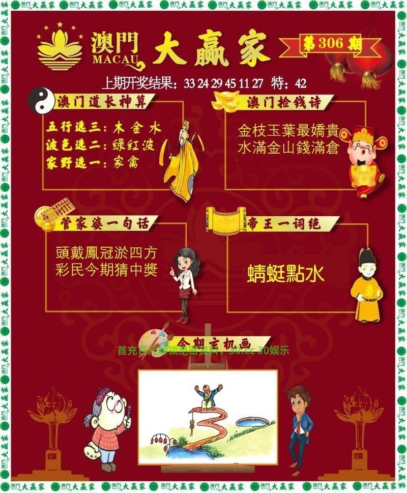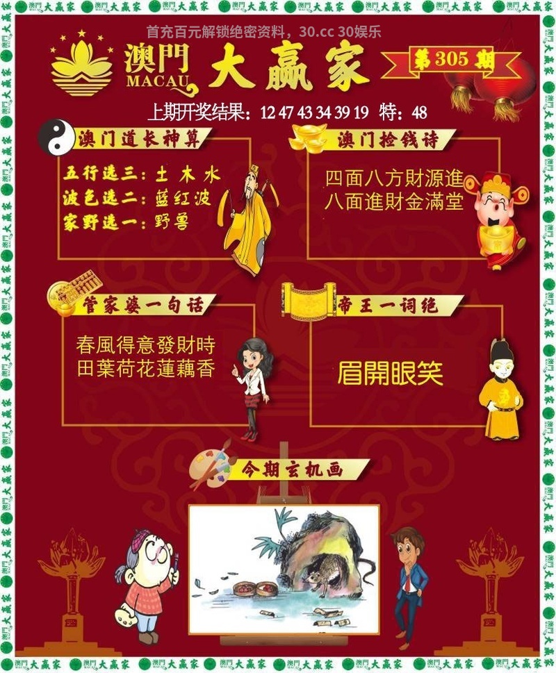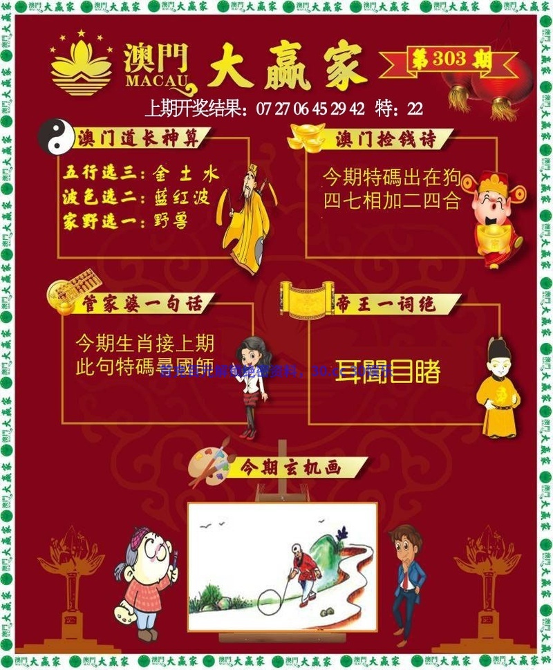 308期:今期生肖二七开,老牛骑马倒着走。十二生肖我老大,一轮红日照天涯。三七开来合数双,江鲤也想跃龙门。花香鸟语成双对,金银财宝随手拿。  |